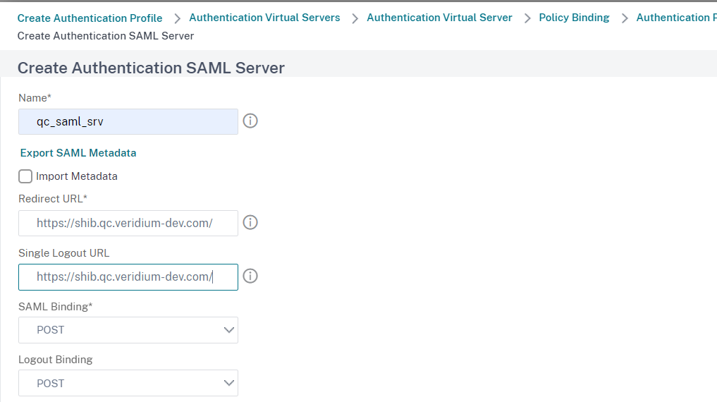 In the Create Authentication SAML Server page, set a Name, deselect Import Metadata, fill in Redirect URL and Single Logout URL(type the POST endpoint from the VeridiumID metadata), set SAML Binding and Logout Binding to POST: