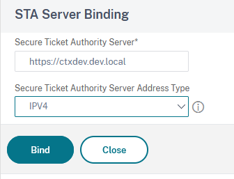 Set the Secure Ticket Authority Server Address Type to IPV4, fill in the FQDN of the delivery controller in the Secure Ticket Authority Server field, then click on Bind: