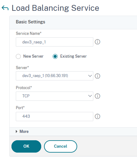 In the next window, type in a Service Name, select Existing Server and, from the drop-down list in the Server section, select the first RAEP server. Set the protocol to TCP and the Port to 443. Click OK to save: