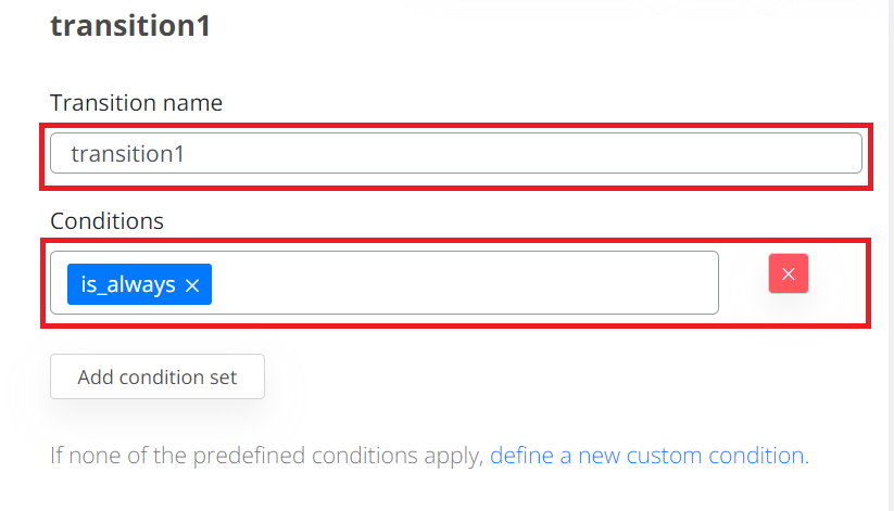 Configure the transitions on the right-side element inspector by combining multiple Boolean condition sets. If none of the predefined conditions apply, define a new custom condition by clicking the link below the form.