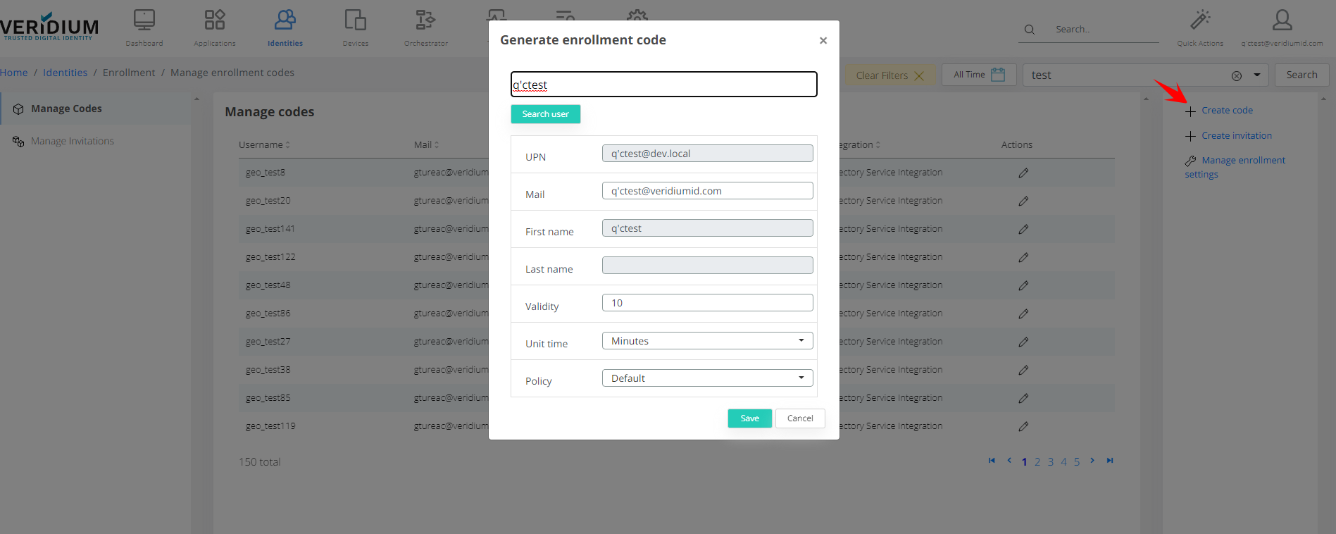 Afterwards, the user who wants to enrol is searched in AD and the following information are retrieved: UPN, mail, first name and last name. The administrator can modify the mail used for receiving the code (TBD if we want to edit the mail or retrieve from LDAP another value) and when clicking the button “Generate code” a new modal will be displayed to select the validity time and policy used for the enrollment code.