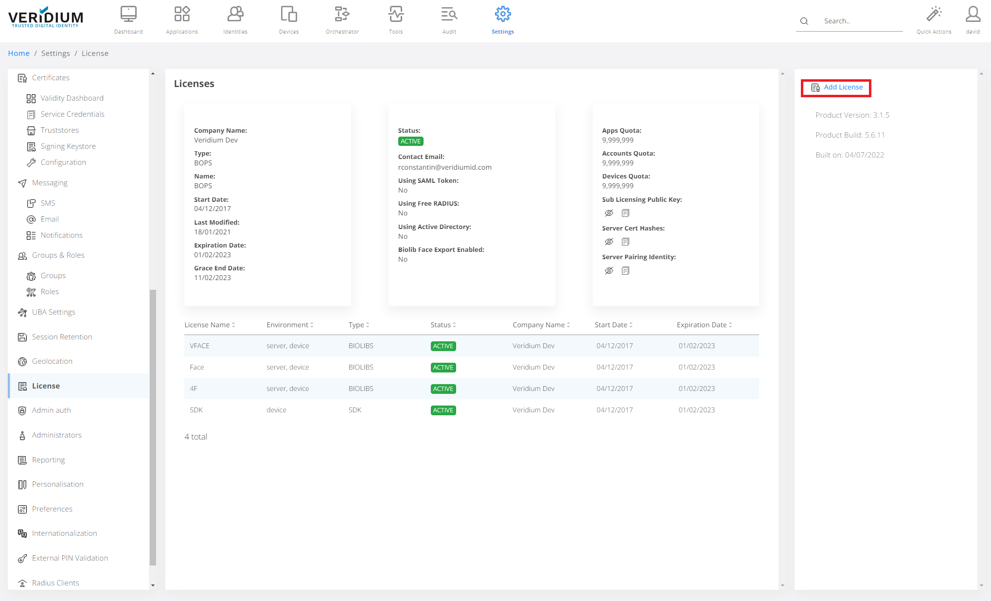 In Veridium Manager, click Settings on top navigation.