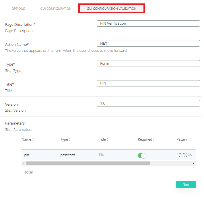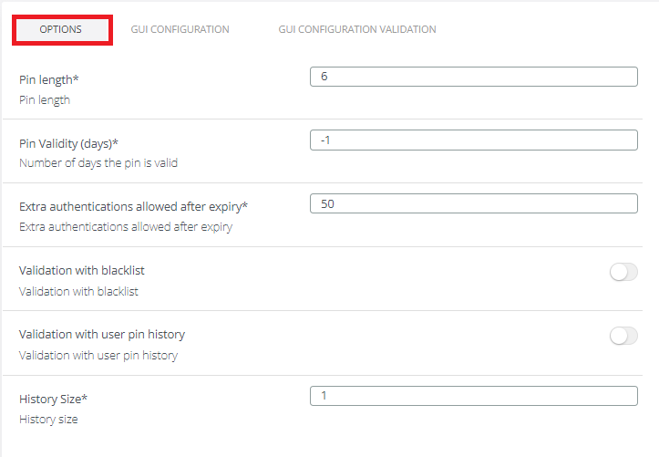 PIN Validity: Number of days the PIN is valid. Value 0 means pin never expires. Negative numbers mean pin is always considered expired (used mainly for testing purposes)