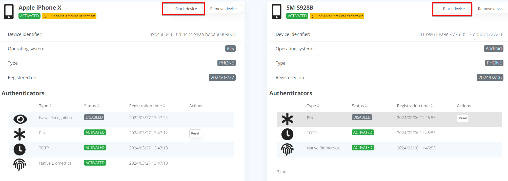 Starting with version 3.6, a new configuration option has been introduced in Veridium Manager / Services / SSP - “Hide the remove option for authenticators and identity” to allow (or not) the users to delete their own devices and identity.