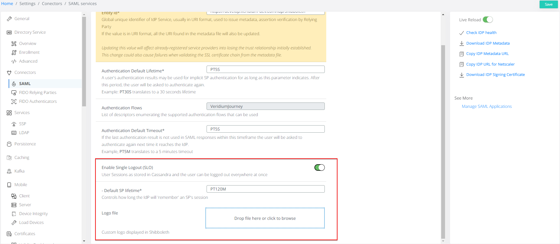 Enable SLO endpoints in the metadata in Veridium Manager: