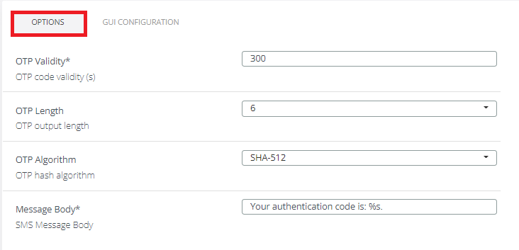 Options tab. OTP Validity: default value is 300s. Time of SMS code validity in seconds.