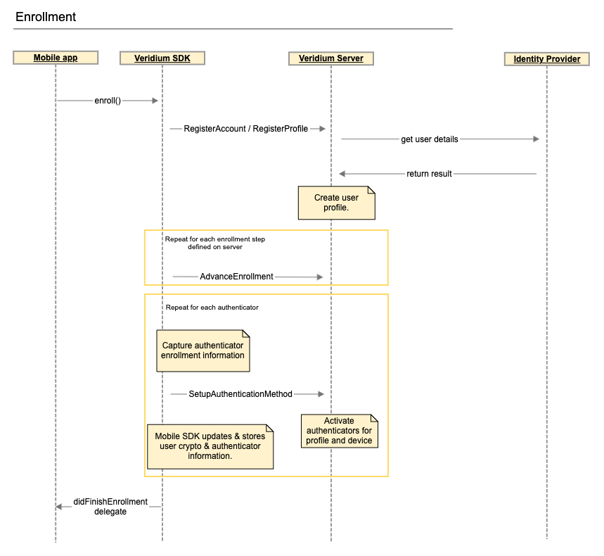 The first step in using VeridiumID for authentication from a user's perspective is to enroll his profile (identity from the target 3rd party system) and authenticator data. The flow diagram is shown below.