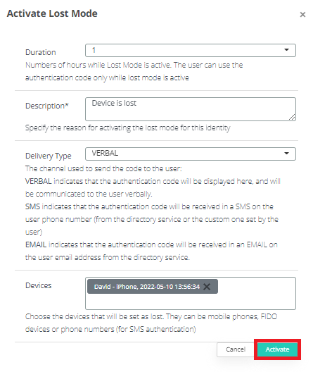 Activate Lost Mode is used when a user (identity) has lost one authenticator. In order to restrict possible use of unwanted user, the authenticator can be marked as lost.