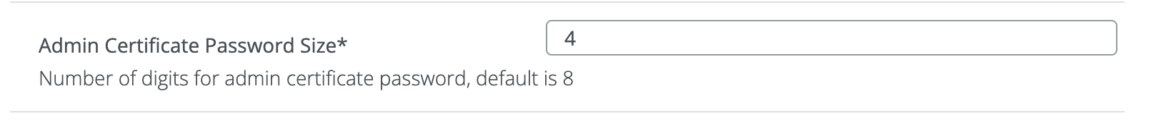 “Send Admin Certificate Password Via Sms” new toggle that by default is set on false. In this case the password will be displayed in the admin view.