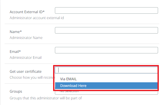 Account external IdFor the “Get user certificate” select whether you want to download certificate locally or send it to email. This is the same for both way to create administrator.