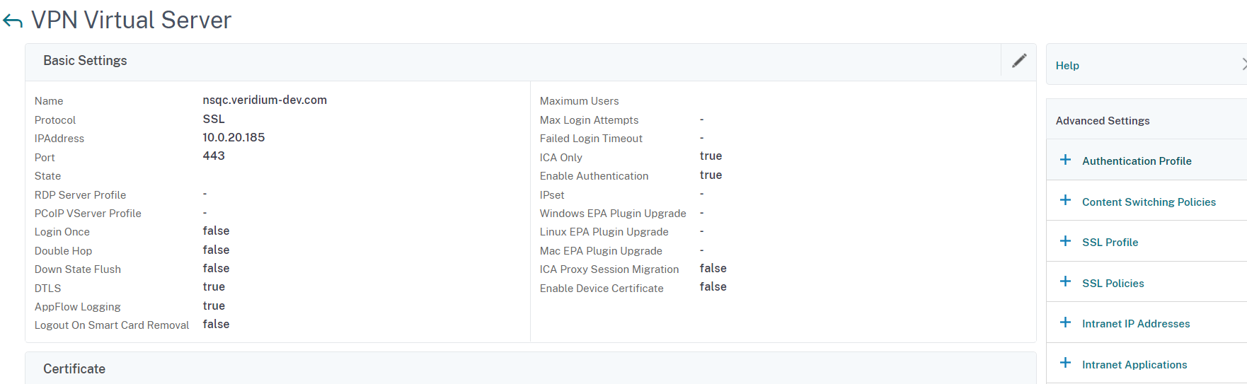 In the Netscaler web interface, access the virtual server settings by clicking on Citrix Gateway → Virtual Servers, then click on the previously created virtual server: