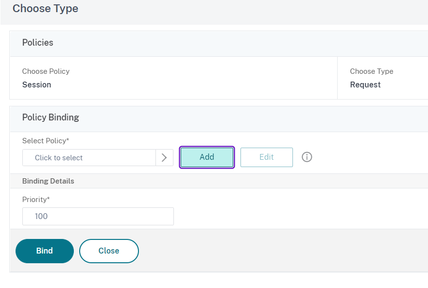 In the Policy Binding section click on Add: