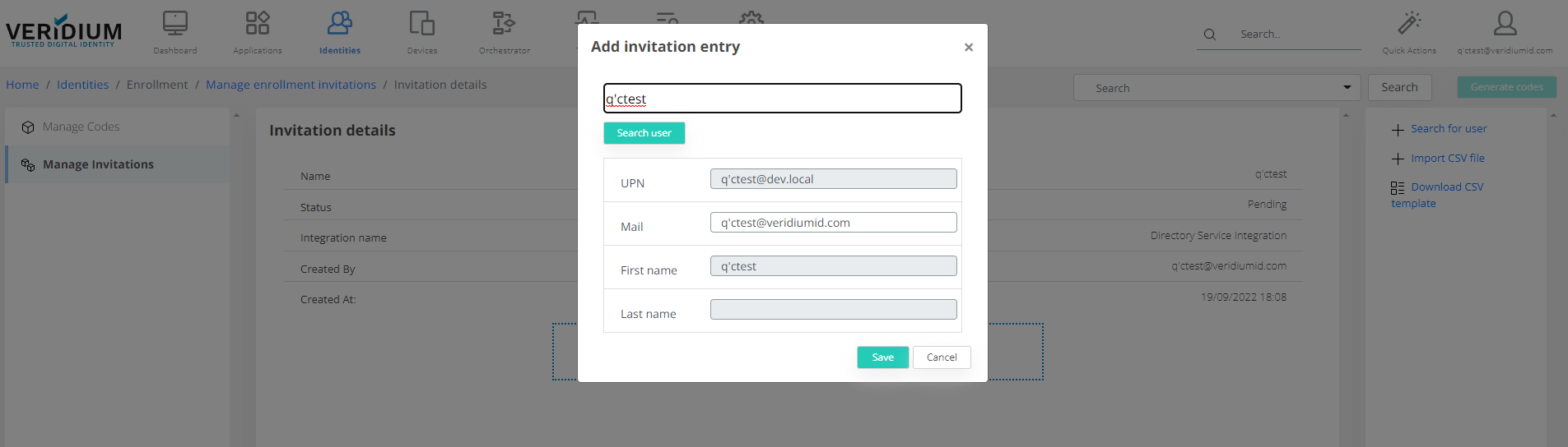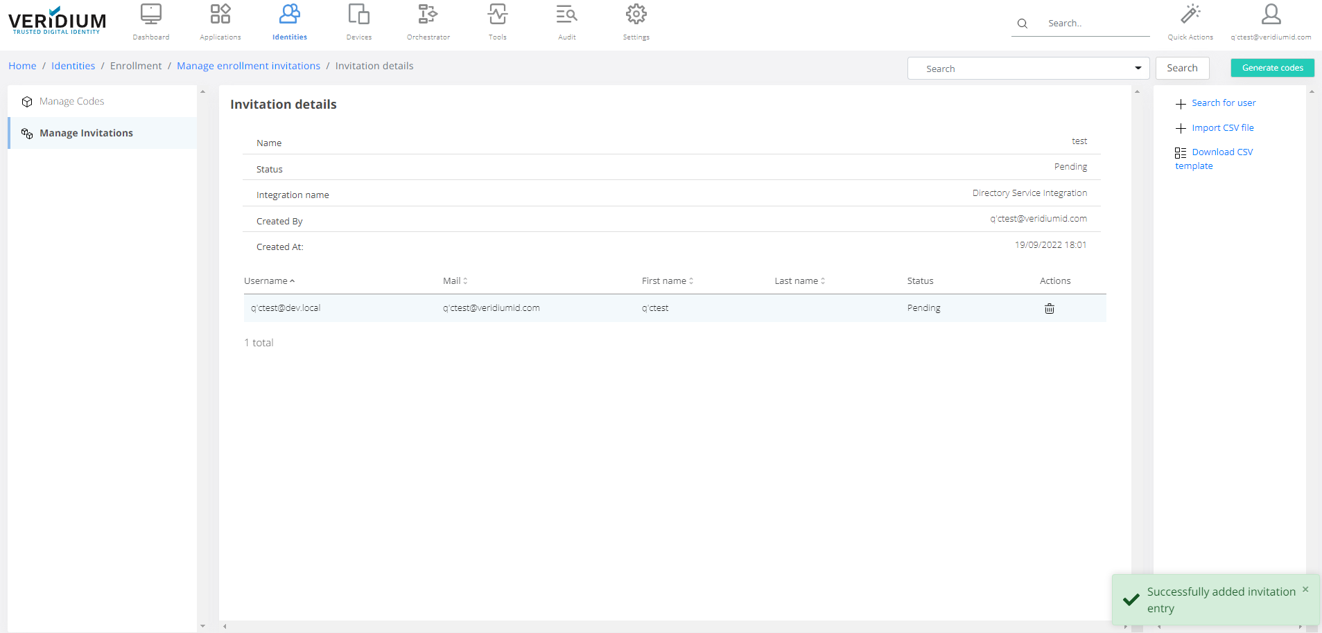 The page used for managing enrollment codes is enabled if there is any integration with Enrollment by invitation enabled and it can be reached by selecting “Manage Enrollment Invitations” option from the right side of the Identities page.