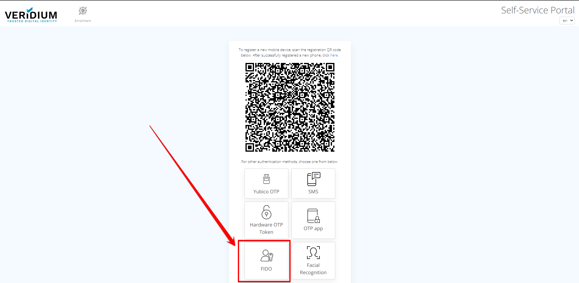 Go to VeridiumID Self-enrollment and click on "FIDO".