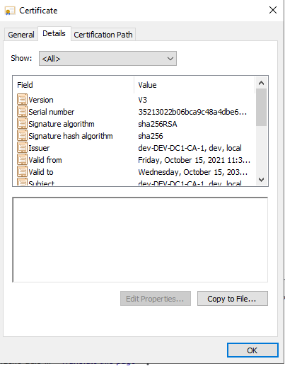 In the Certificate window, switch to Details tab and click on Copy to File: