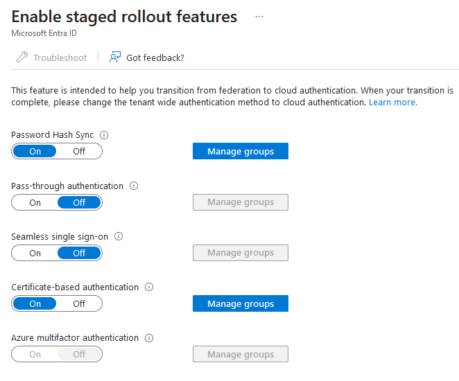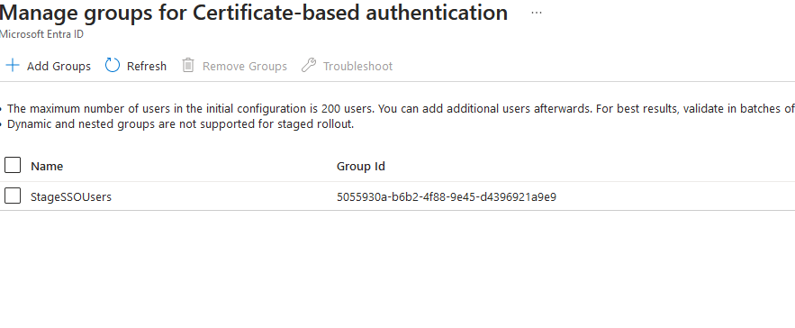 This document will provide a short procedure in order to enable and configure stage rollout feature along with Microsoft CBA (certificate based authentication using an internal CA). The stage rollout feature allows to enable different authentication methods for certain users, thus preparing the migration of internal users to the cloud.