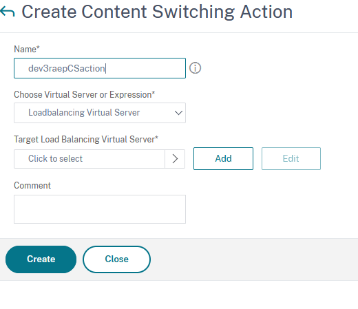 Go to Traffic Management → Content Switching → Actions and click on Add: