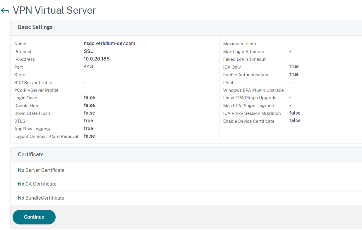 In the Netscaler web interface, access the virtual server settings by clicking on Citrix Gateway → Virtual Servers, then click on the previously created virtual server: