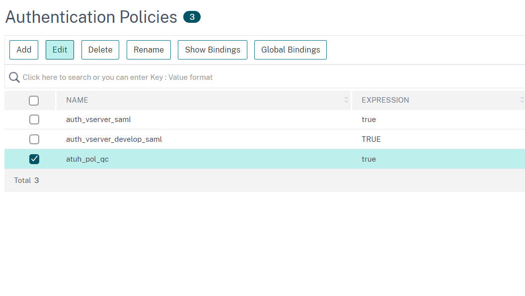 In the Authentication Policies window, select the appropriate policy for your virtual server and click on Edit: