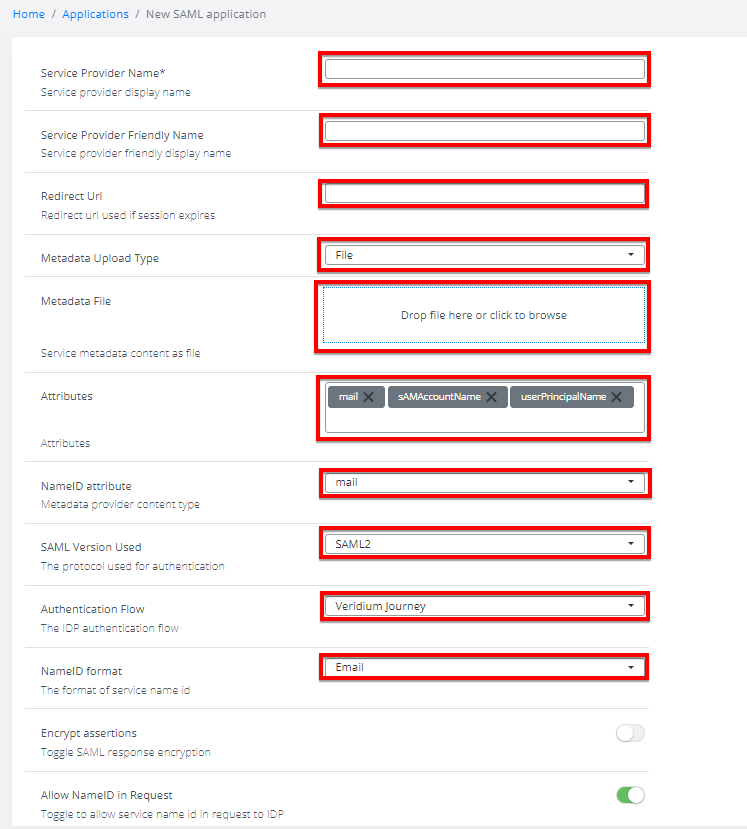 Fill in the requested information regarding SAML SP properties on the detail page displayed.