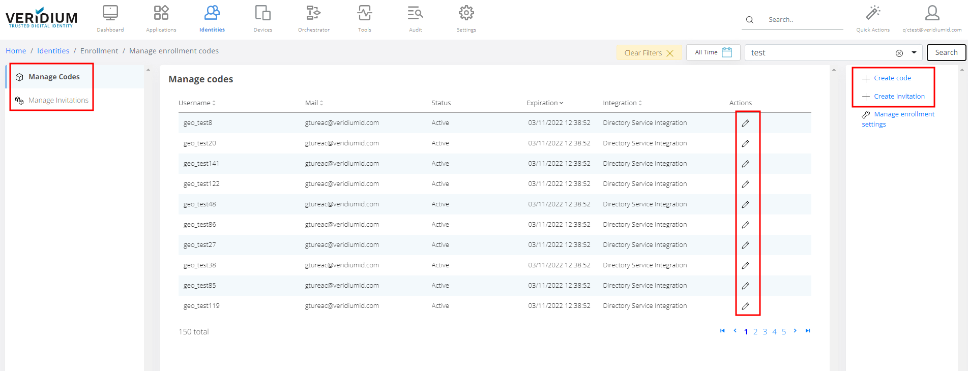 The page used for managing enrollment codes is enabled if there is any integration with Enrollment by invitation enabled and it can be reached by selecting “Manage Enrollment Invitations” option from the right side of the Identities page.