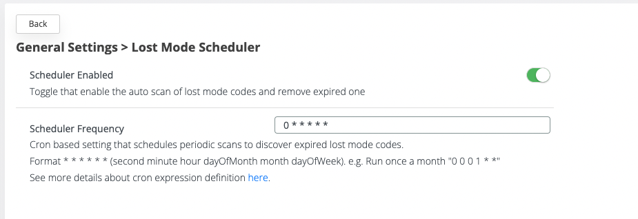 A job scheduler is implemented that can scan the lost mode table with a configurable frequency and for the devices detected that have met the time criteria (lost mode duration expired), it will reactivate them.