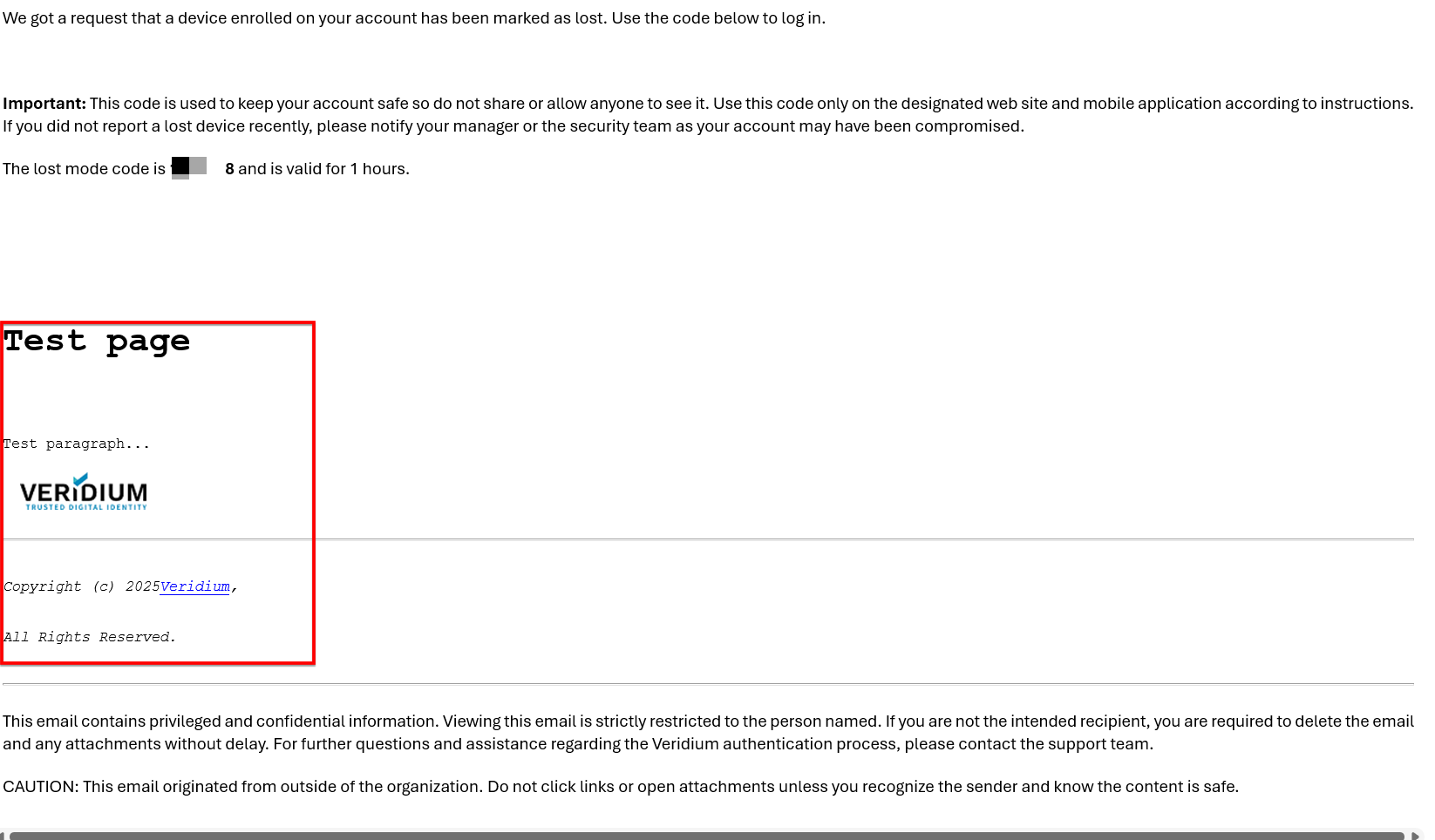 Below is a sample HTML block that displays regular formatting samples inside an email template - such as font control,, paragraph markup and image insertions.HTML<html> <head> <title>Test Template Demo</title> </head> <body> <h1>Test page</h1> <p>Test paragraph... <img src="https://docs.veridiumid.com/__assets-12b7f037-8432-444f-b666-2ec4549e2b11/image/veridium-logo-color%20-%20Copy25.png" alt="Pt IonutD"> <hr> <i> Copyright (c) 2025 <a href="https://www.VeridiumID.com">Veridium</a>, <br> All Rights Reserved. </i> </body> </html>For example, integrating this block in the LOST_MODE_EMAIL template will make it look like this: