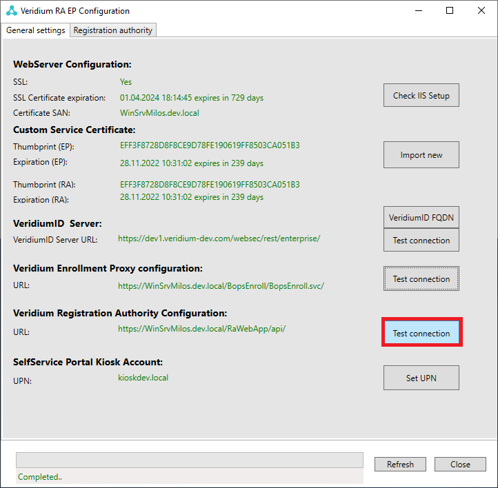 Start VeridiumID RA & EP configuration and in the section "VeridiumID Registration Authority configuration", press "Test connection" button.