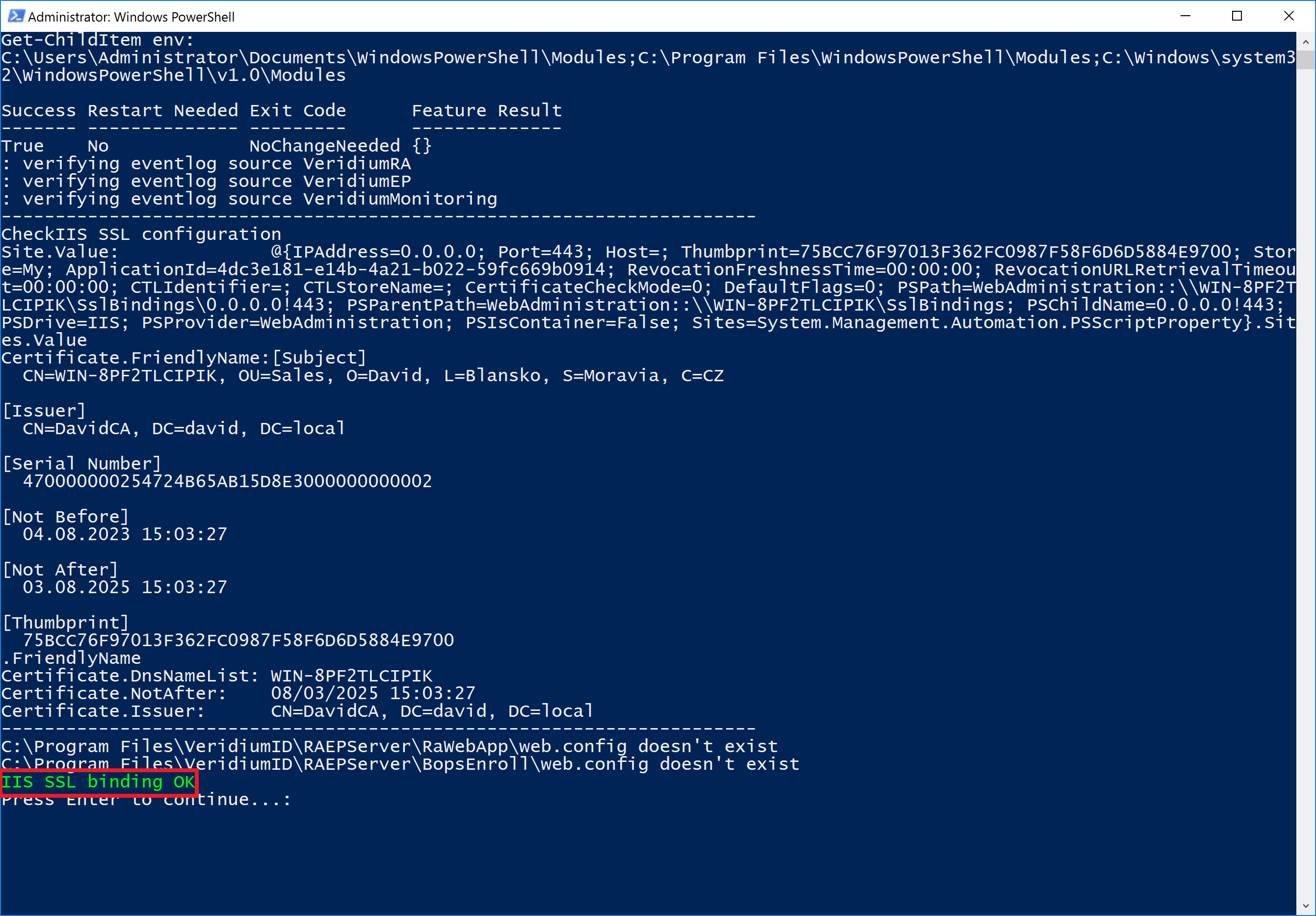 The following PowerShell window will appear. PowerShell script checks and install missing Windows components and check IIS certificate. Press any key to close the PowerShell window and continue.