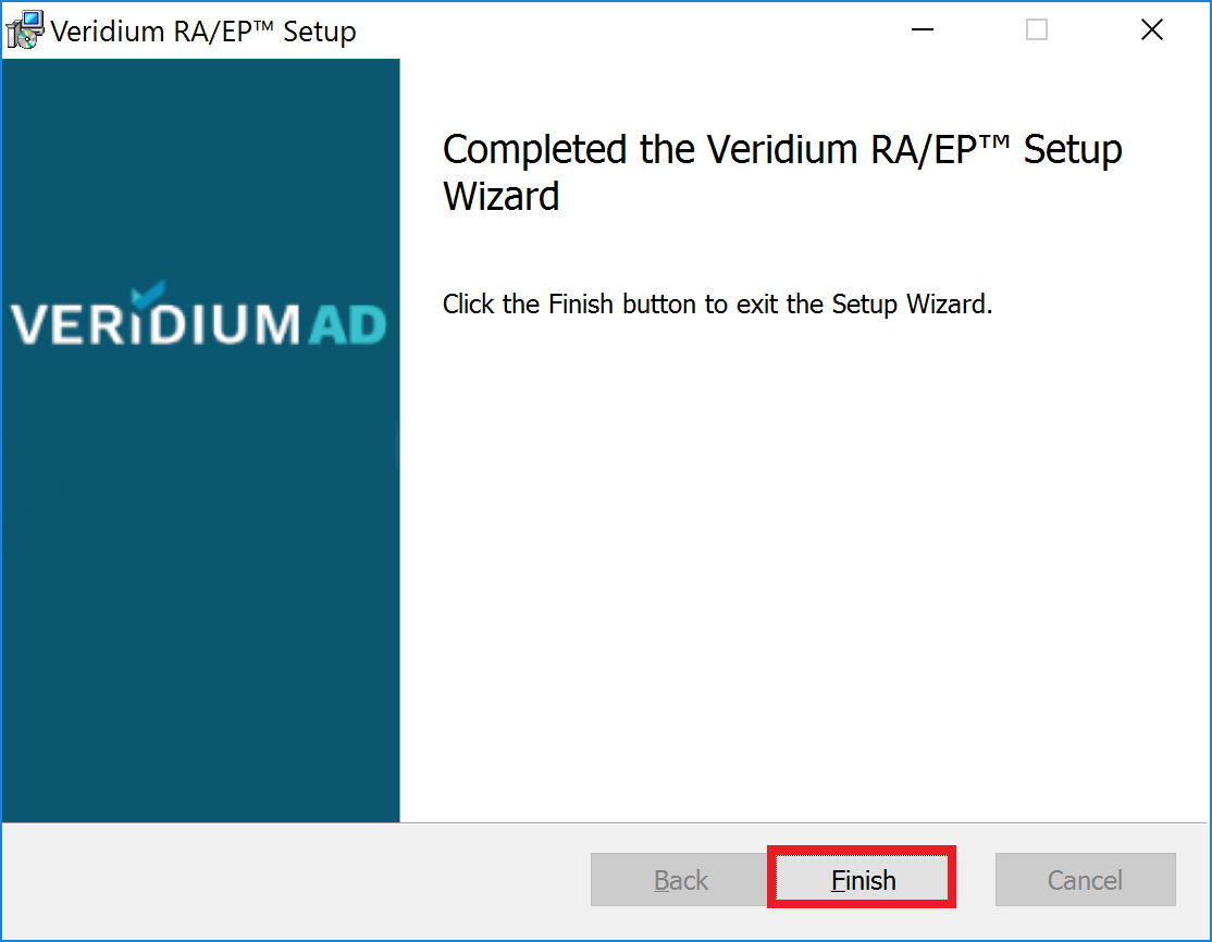 In order to learn how to complete the RAEP Configuration tool, please check https://veridiumid.atlassian.net/wiki/spaces/VD/pages/3215169736/General+configuration , once it is done, Click “Finish“.