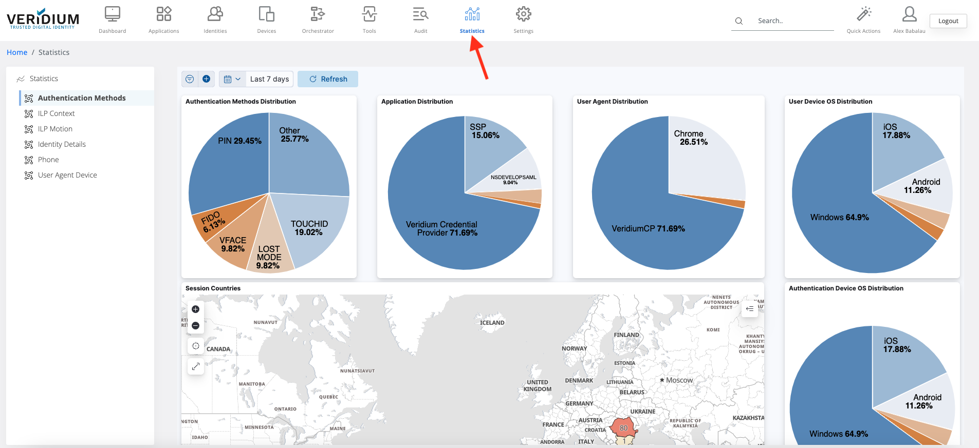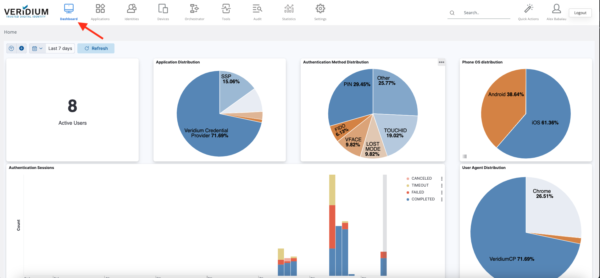 Starting from version 3.6, the set of available statistics in the admin application has been improved. This change replaces the dashboard on the “Dashboard” page, as well as the statistics on the “Statistics” page. This new set of dashboards focuses on authentication sessions in a specific time range.