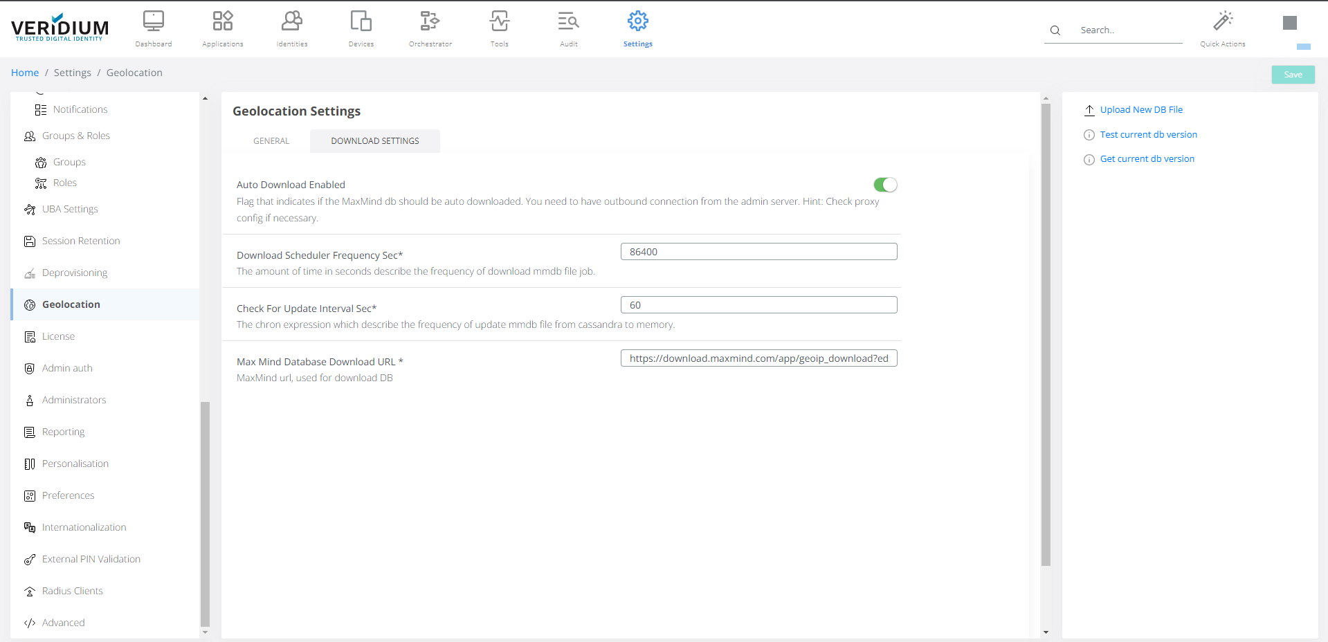 In order to ensure an automatic process for updating the GeoIP location resolver database, a configurable mechanism is available in Veridium Manager / Settings / Geolocation.