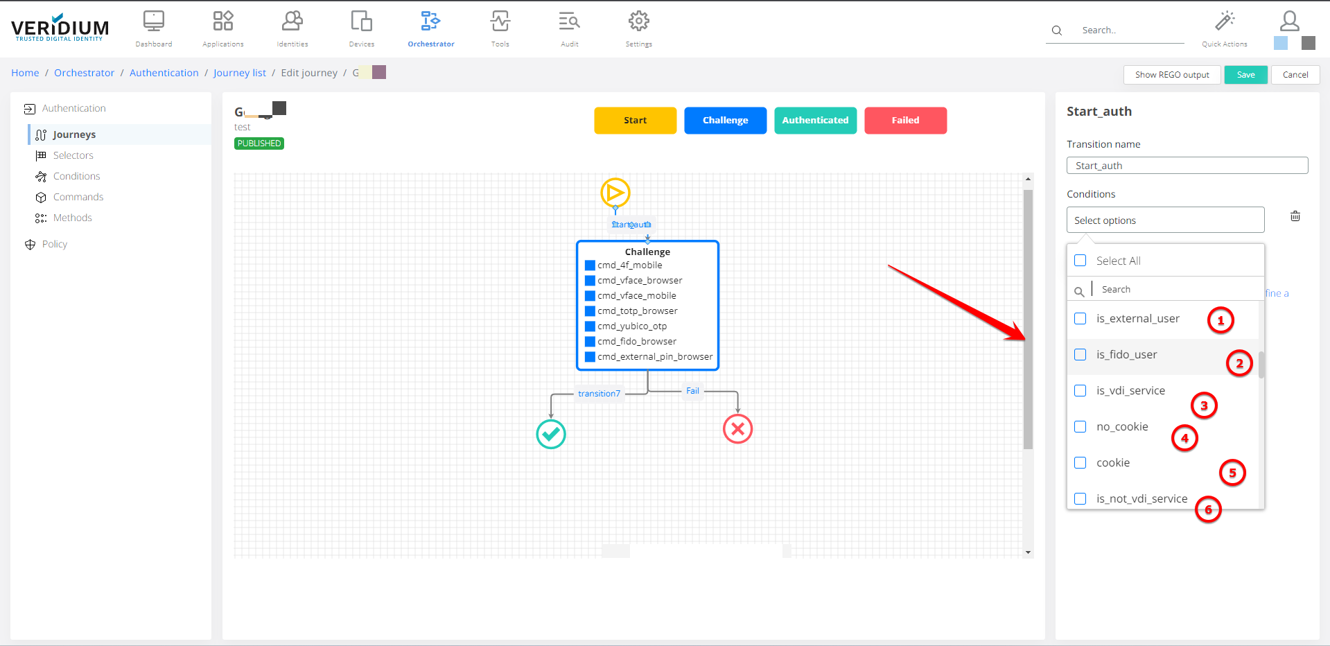 Conditions are Boolean Rego block blocks that will be evaluated during a journey or selector execution and are used to create transitions between the states. During the initial system configuration, a set of default conditions will be registered. They will cover most scenarios of authentication business logic. Registering custom conditions must be compliant with the structure of the session context model. For more information, https://productdocs.veridiumid.com/docs/veridium-manager/authentication/context-data