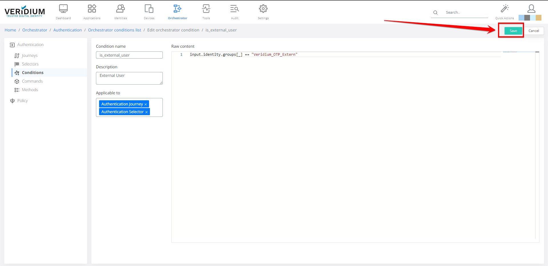 Type/edit the custom condition that will be evaluated when executing journeys/selectors. For a comprehensive list of attributes, productdocs.veridiumid.com/docs/veridium-manager/authentication/context-data.