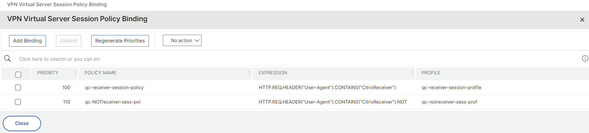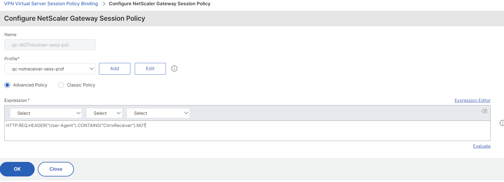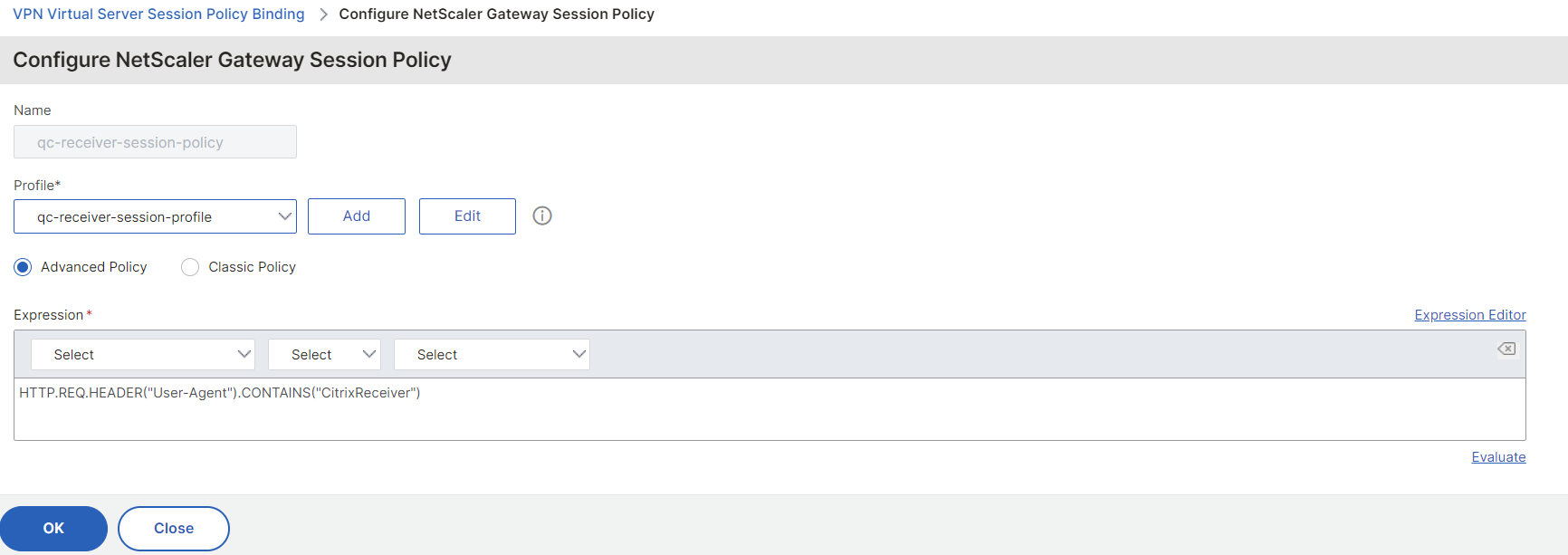 Configure a Name, type HTTP.REQ.HEADER("User-Agent").CONTAINS("CitrixReceiver") in the Expression field and then click on Add to add a new profile: