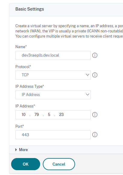 In the Basic Settings window type in a name, select TCP as Protocol, slelect IP Address as IP Address Type, fill in the ip address in the IP Address field and set the port to 443. Click on OK to save: