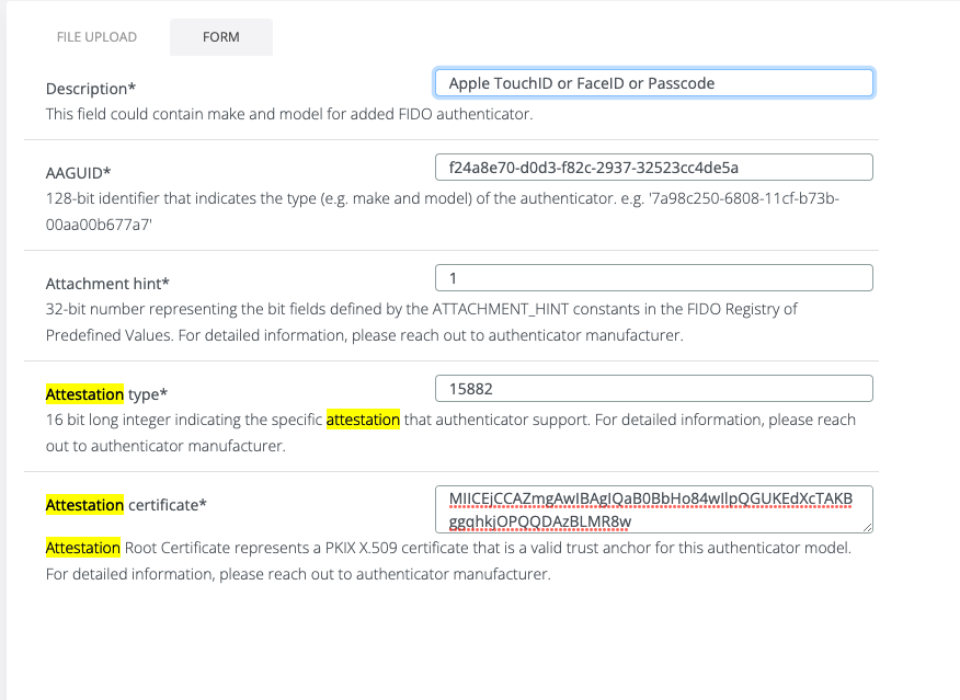 On iOS/iPadOS < 16 and macOS < 13 Apple uses a privacy Attestation CA that is only supported by Safari. Since this was not included in the FIDO MDS service, the authenticator attestation should be manually imported in the Veridium Manager > Settings > FIDO Authenticators > Add FIDO Authenticator and upload the following attestation statement (if upload is not possible use the form to fill in the details).