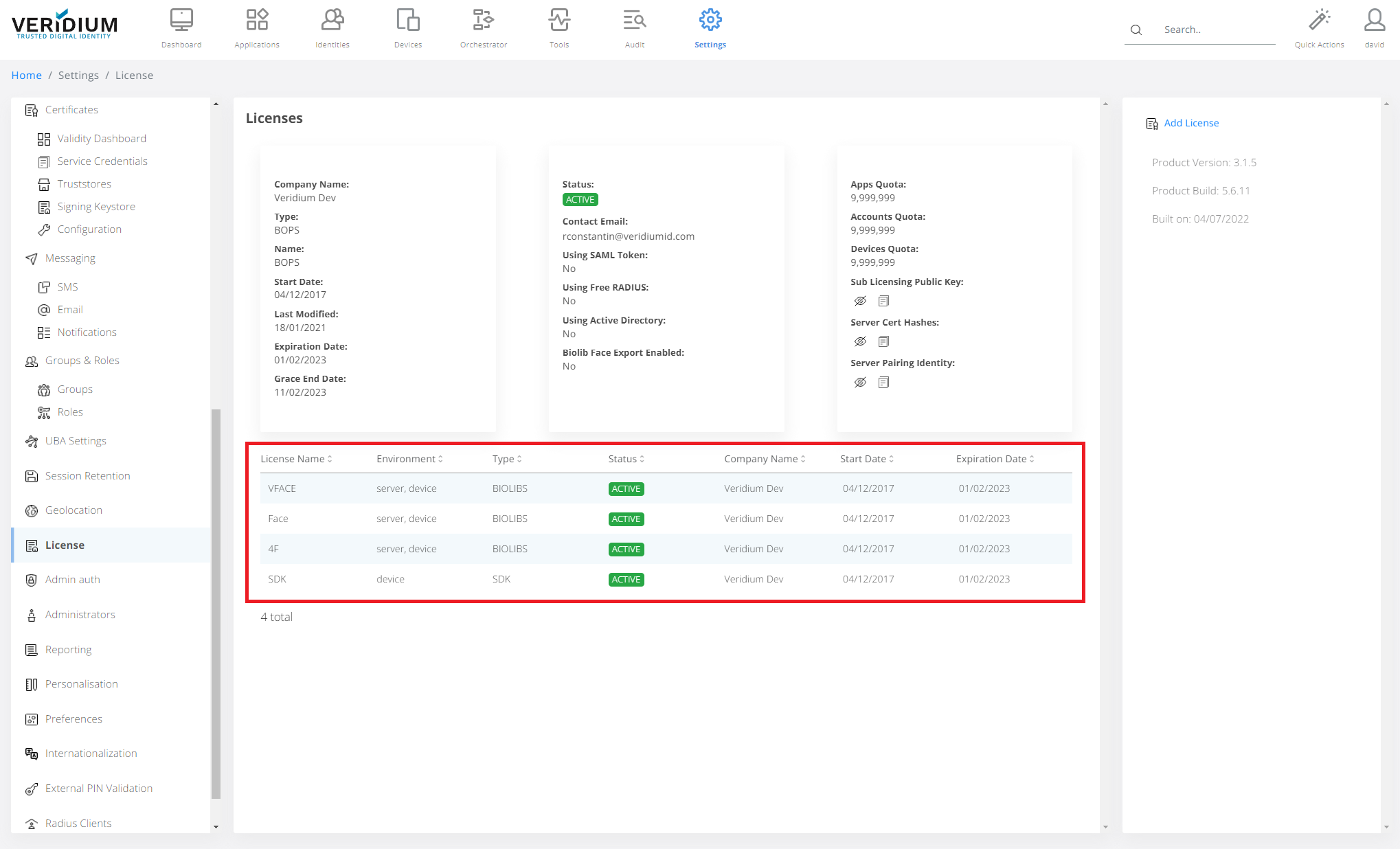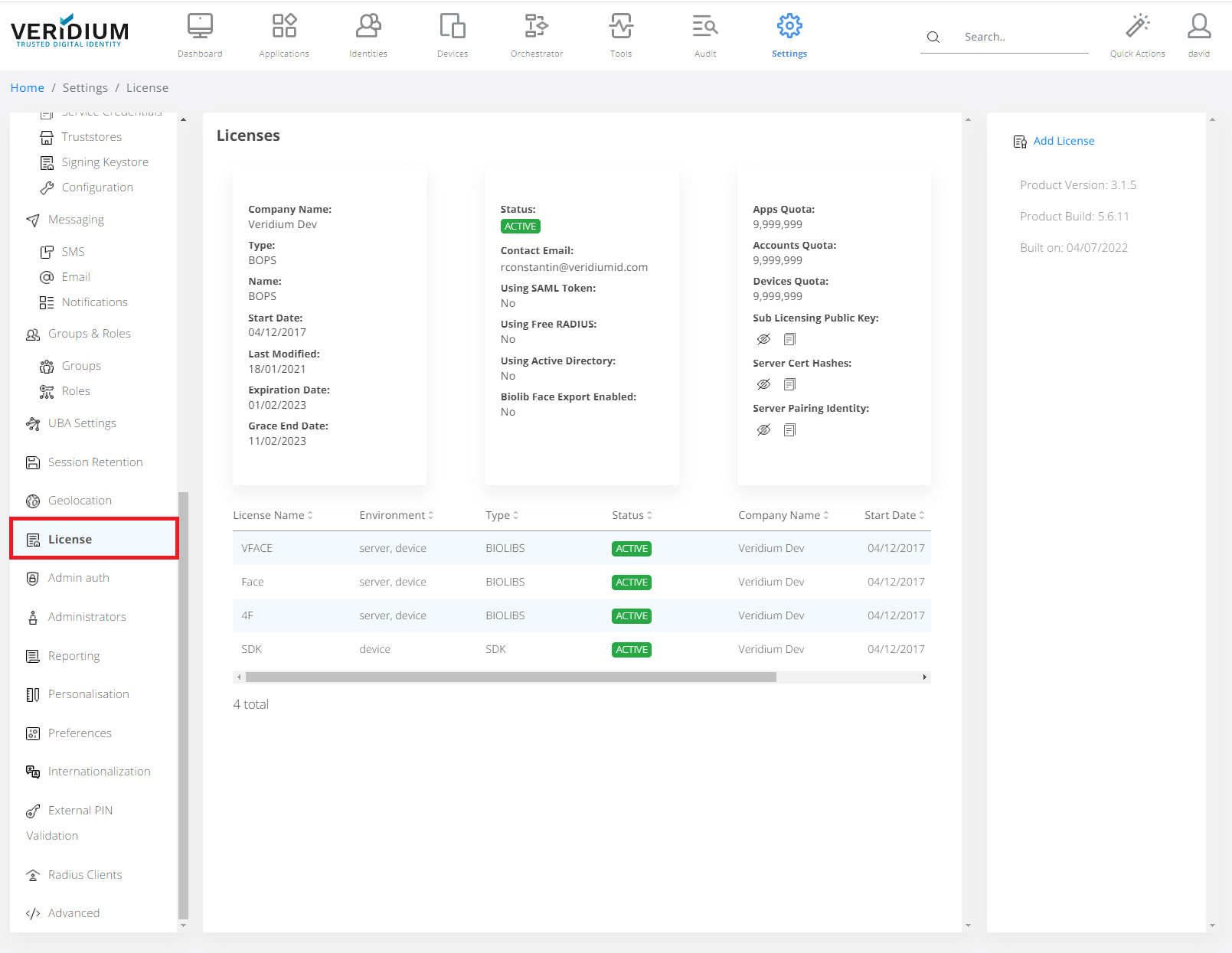 In Veridium Manager, click Settings on top navigation.