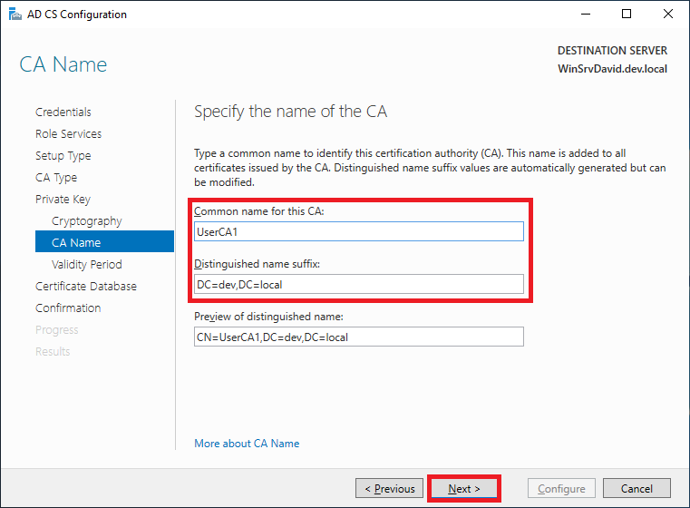 8. On the CA Name page, keep the suggested common name for the CA or change the name according to your requirements. Ensure that you are certain the CA name is compatible with your naming conventions and purposes, because you cannot change the CA name after you have installed AD CS. Click Next.