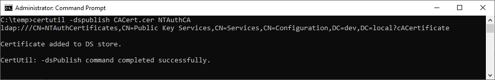 certutil -enterprise -addstore CA.cer NTAuthCA