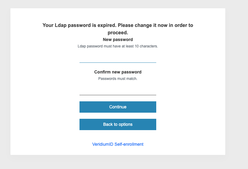 If the difference between the expiration date given by LDAP and the day of authentication is less than 11 days, the user will be proposed to change his password inside the Veridium flow.