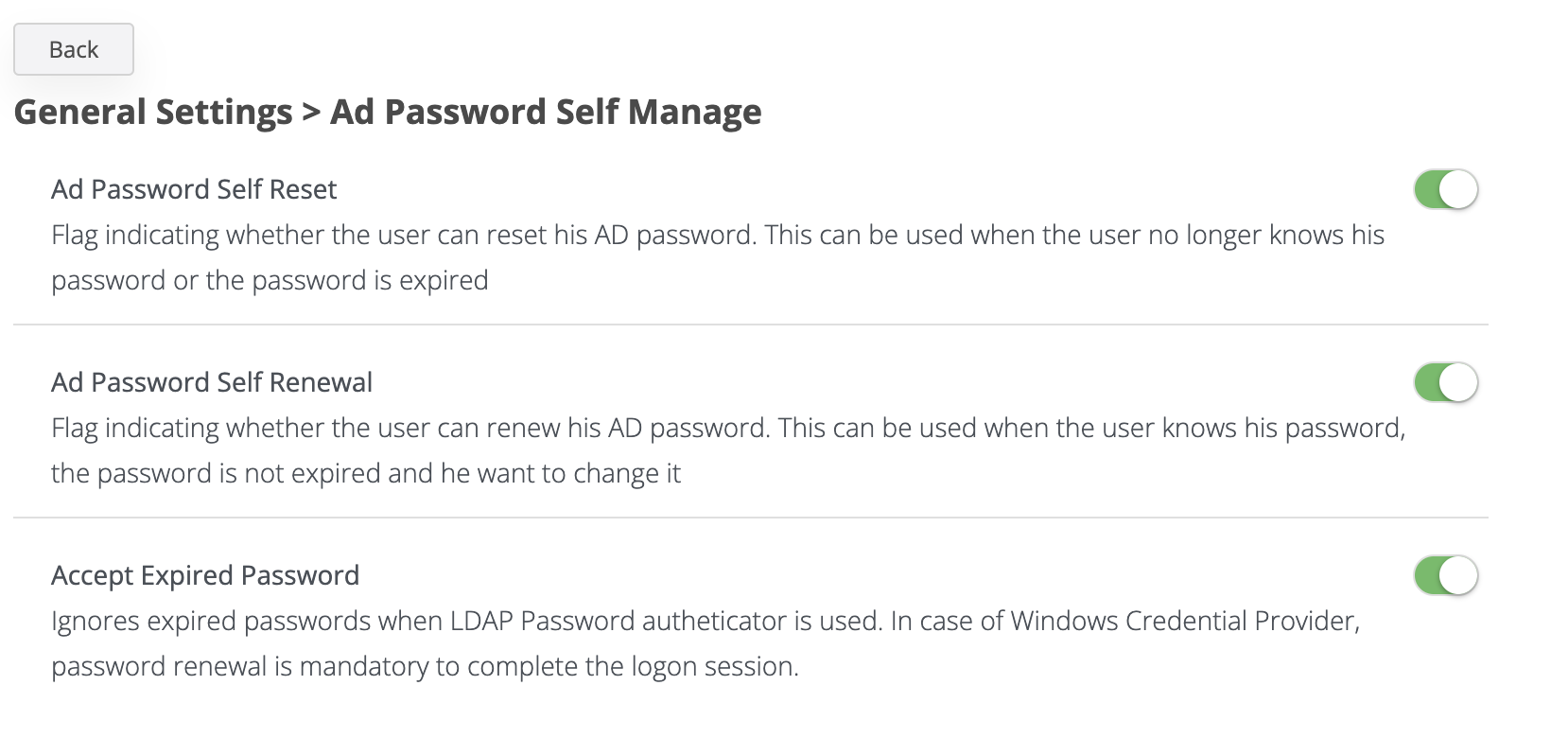 If the self-renewal/self-reset setting is activated, after authentication, the system will check the difference between the expiration date provided by LDAP and the authentication date. If the difference between them in days is smaller than the days configured from when the user will be notified, the system will propose the user to change his LDAP password.