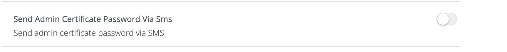 “Send Admin Certificate Password Via Sms” new toggle that by default is set on false. In this case the password will be displayed in the admin view.