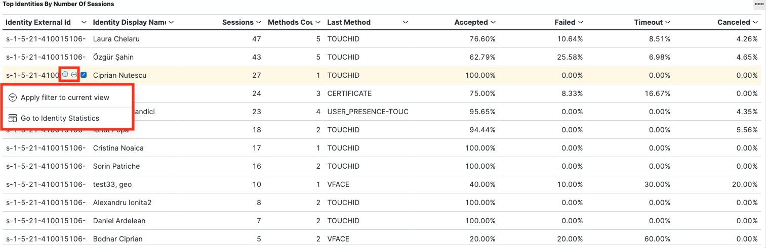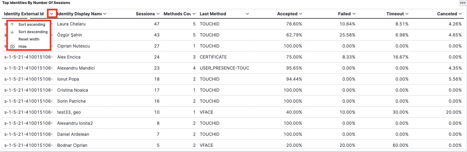 This type of table is used for displaying different aggregations over authentication sessions, grouped by one or multiple fields. For example, the “Top Identities By Number of Sessions” aggregation table groups the authentication sessions by Identity External Id and Identity Display Name (first two columns), and presents some aggregations in the following columns (Session count, distinct Authentication methods used, and so on).