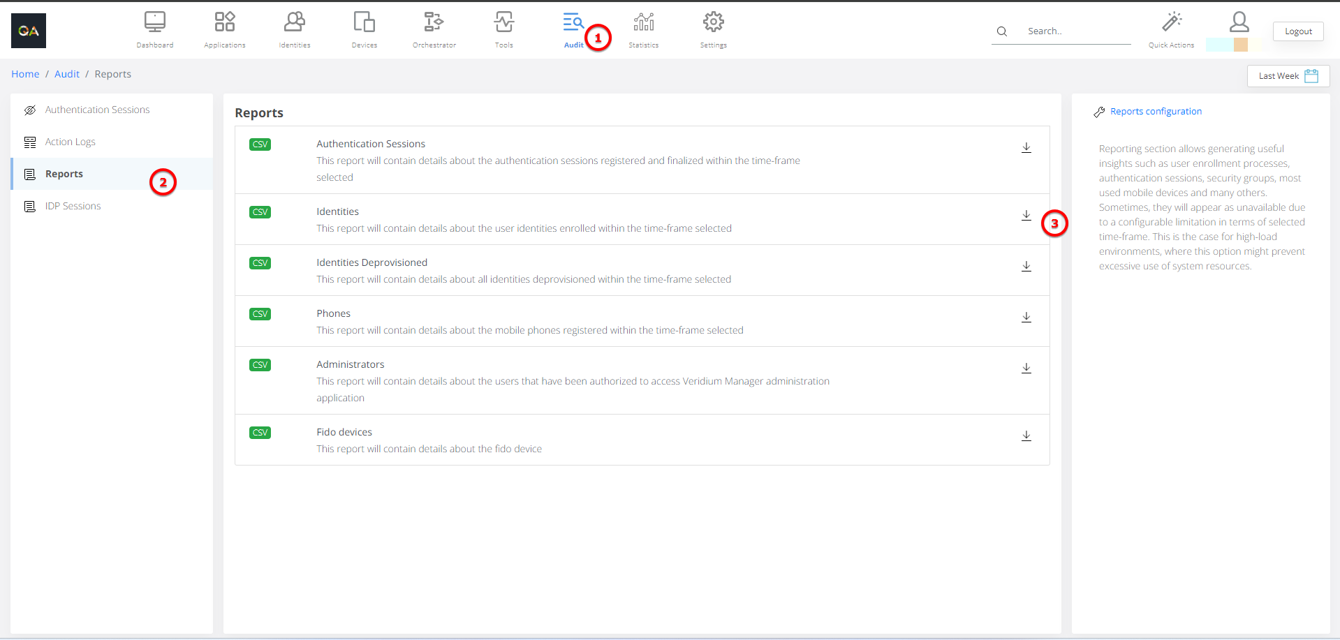 In order to download a CSV report on existing administrator, go to Audit / Reports and click on Administrators entry. Note that the resulted report will contain the users registered in the specific timeframe set on the top-right corner of the screen.