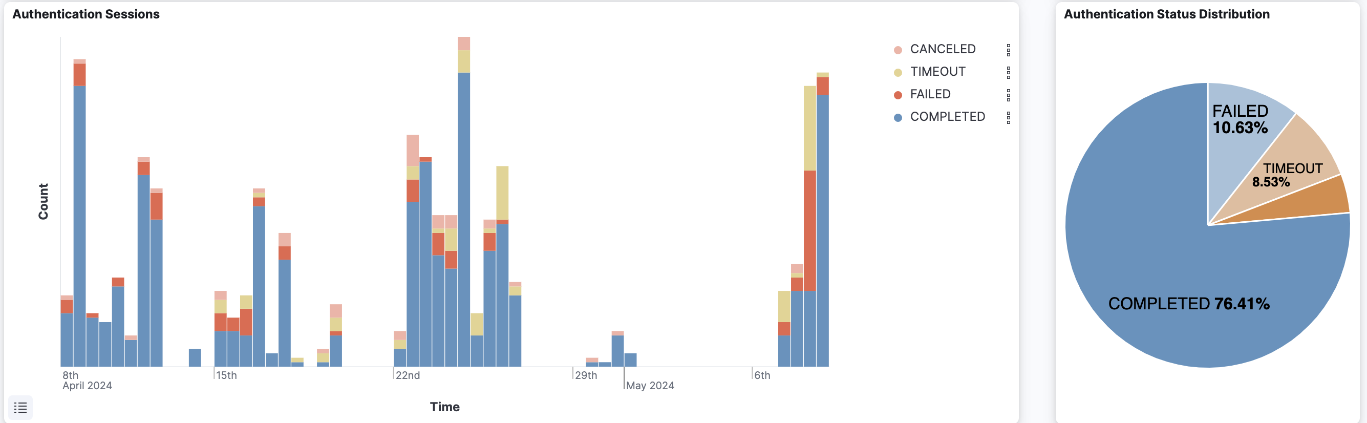 Authentication sessions bar chart which provides an overview in time of the number of authentication sessions created, classified by their outcome