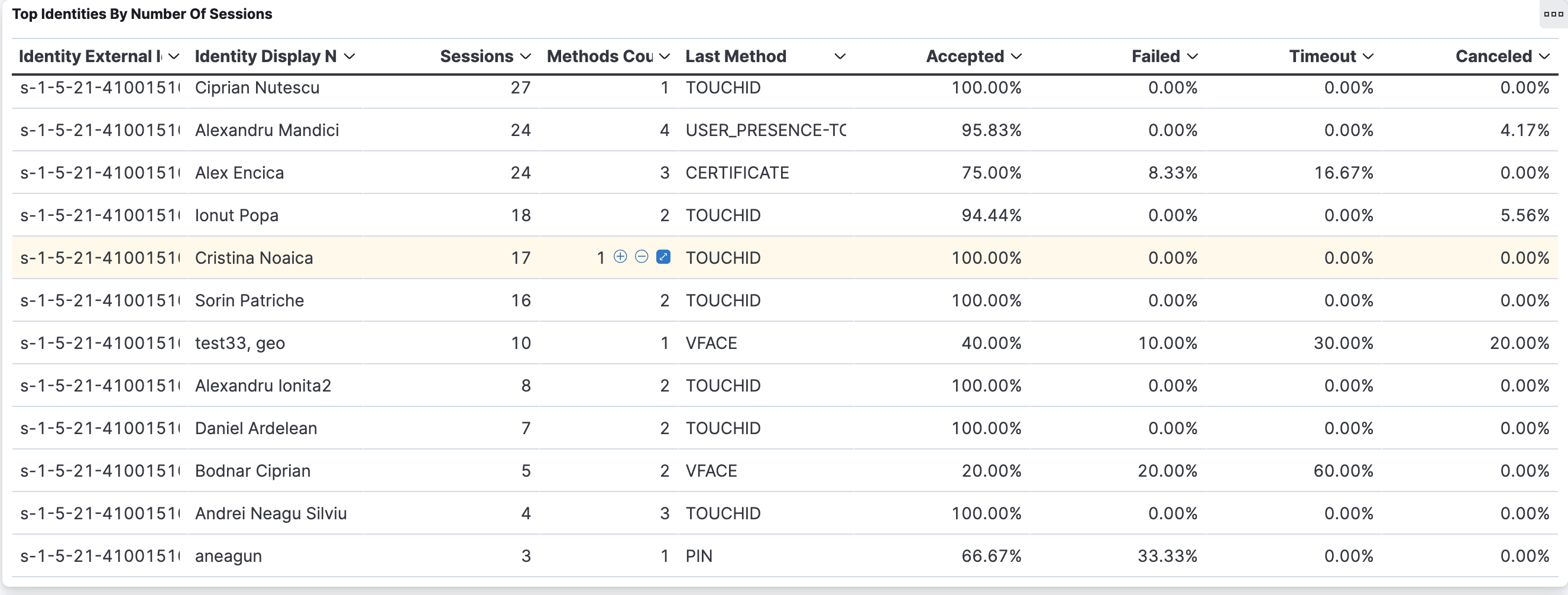 The “Top identities by number of sessions” aggregation table shows the authentication sessions grouped by Identity External Id and display name. For each identity, the number of sessions, the distinct authentication methods used, the last of those methods used and the outcome distribution of those sessions are computed. This table only shows the top 100 identities sorted by the number of sessions performed in the dashboard time range. The user can use this table to navigate to the Identity Details dashboard by using the “Identity External Id” column