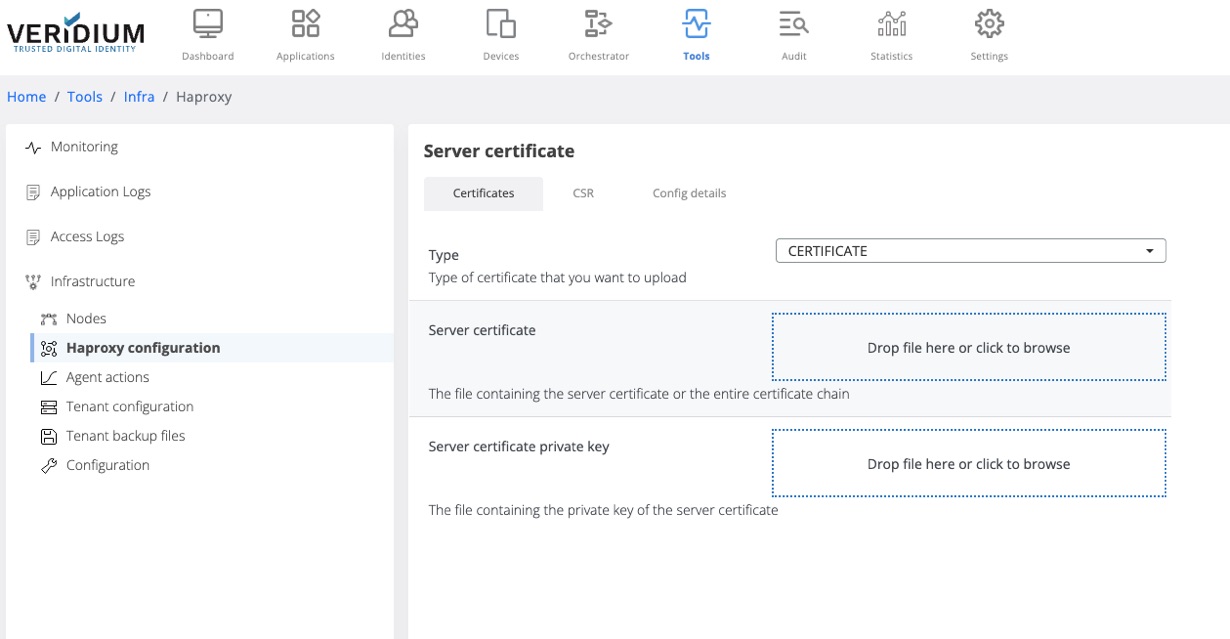 In Veridium manager go to Tools → Haproxy configuration → CSR tab