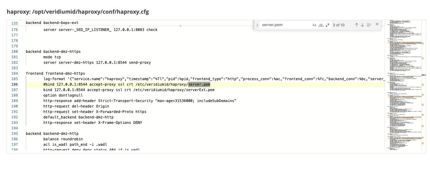 in the content box, search for the string “server.pem”. For each occurrence found, comment the line (by adding # in front of it) where “server.pem” was found and uncomment the commented line below which sets the serverInt or serverExt certificates, as in the example below. There should be 10 occurrences where this change needs to be made.