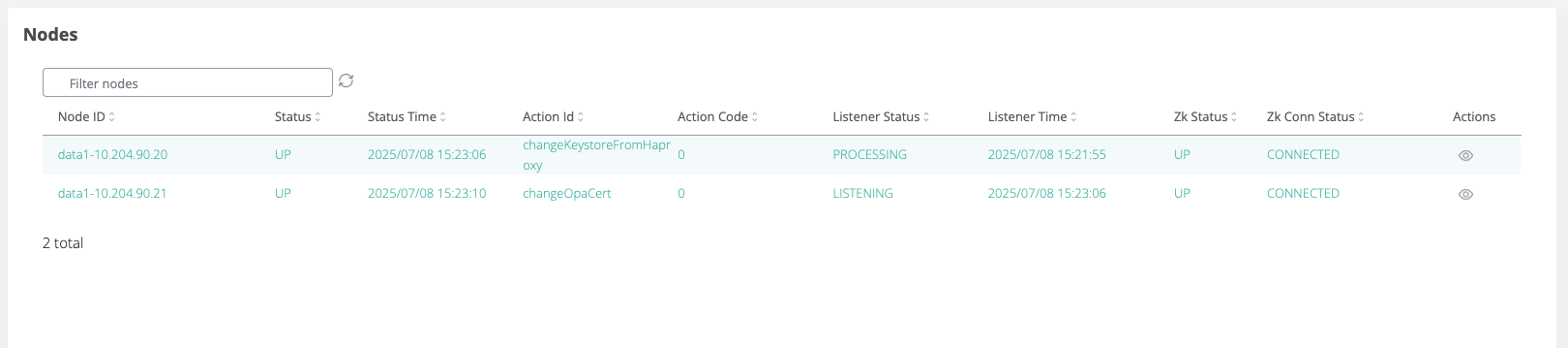 In the Nodes list, check the node where the command was executed and wait for the node line to turn green and the status to change to “start/stop/restart<serviceName>”